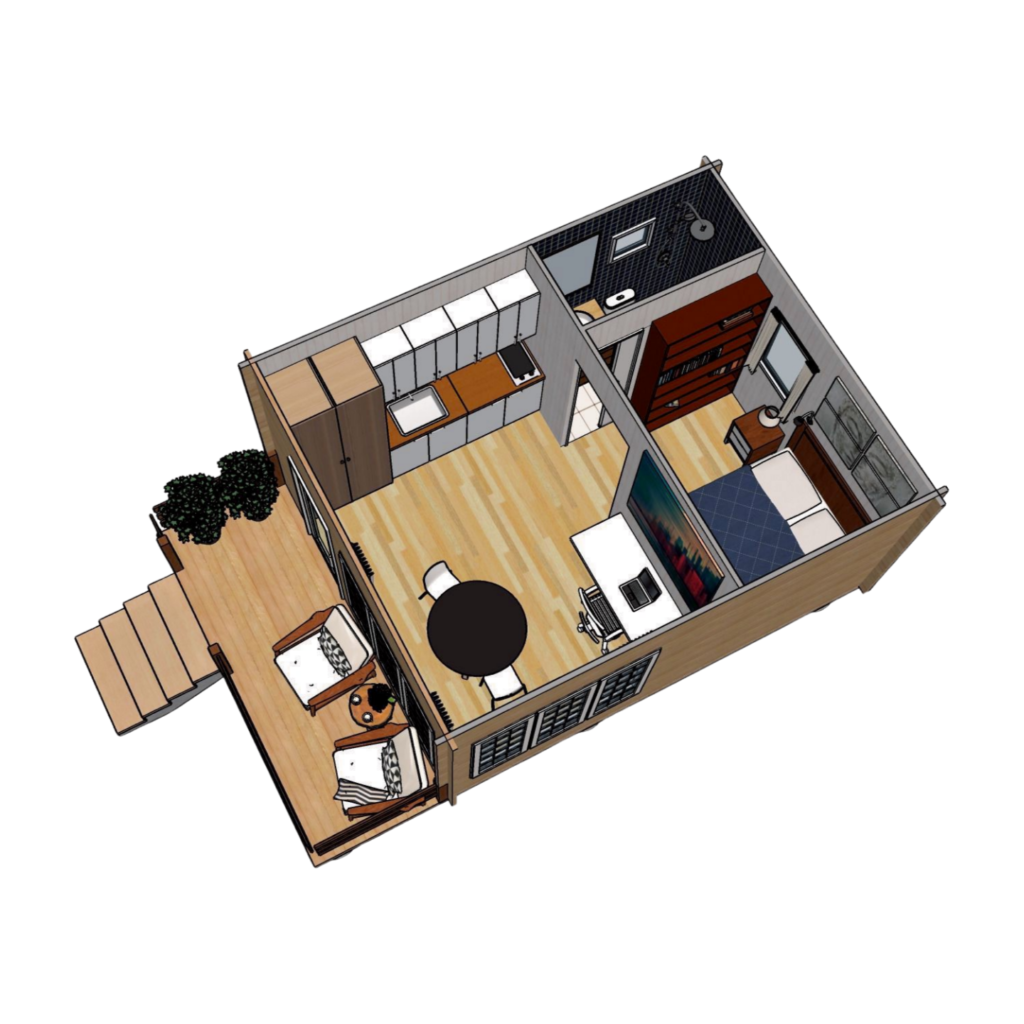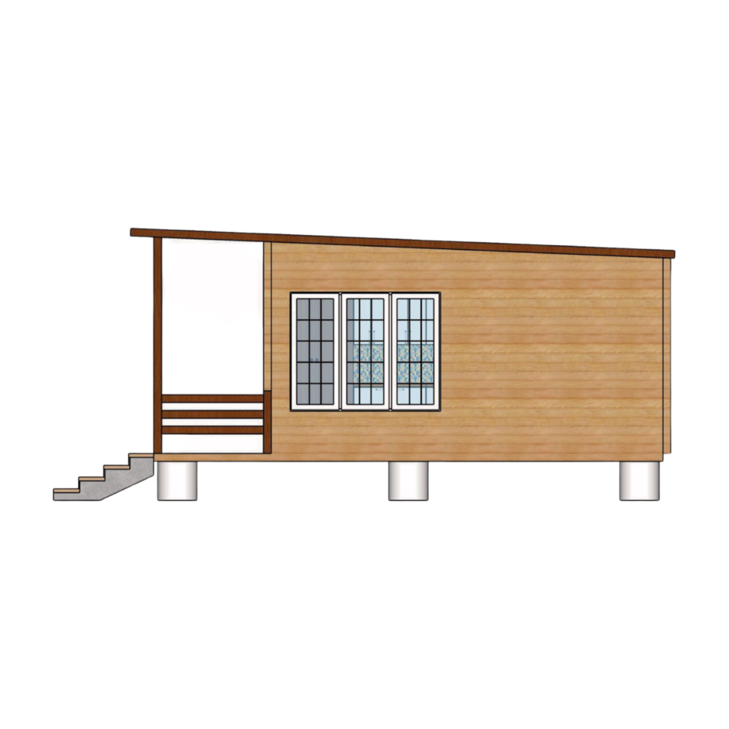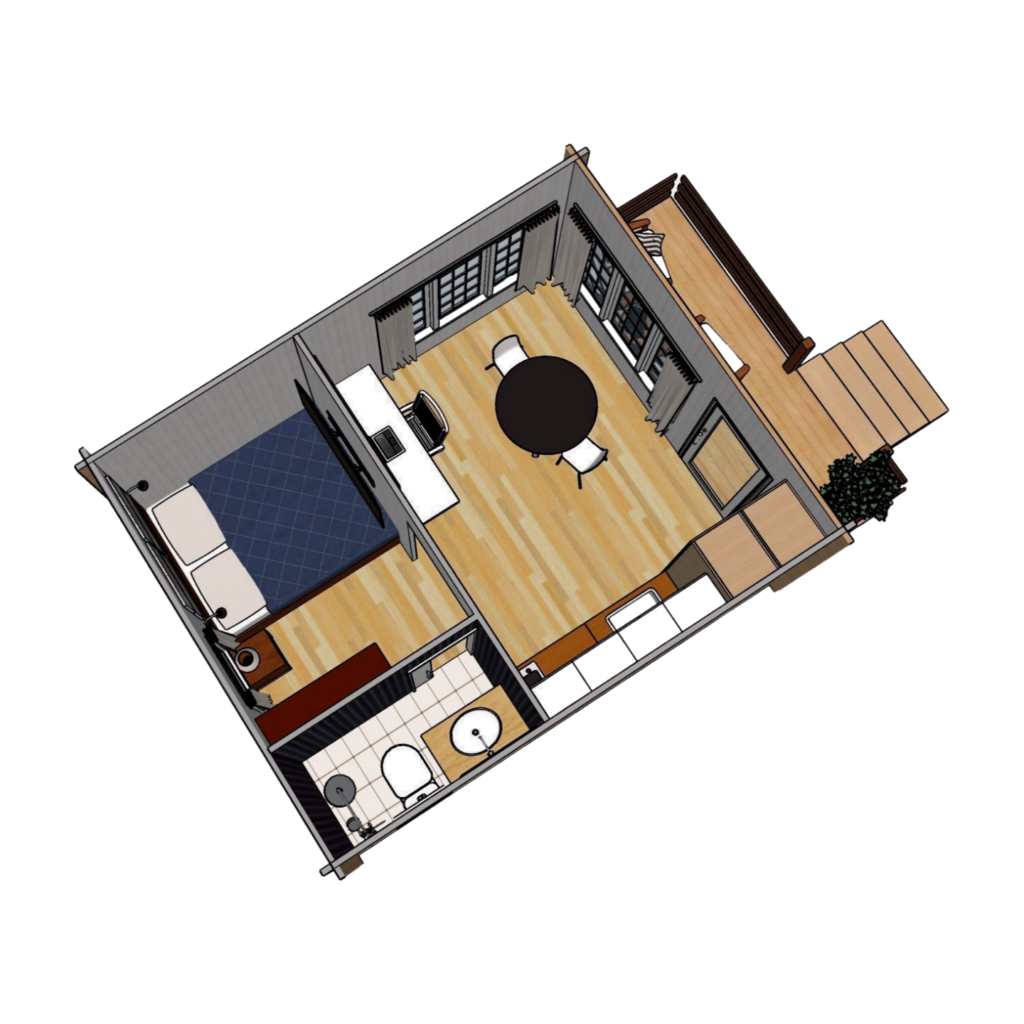 A cozy compact house suitable for a couple. It fits a kitchenette. Includes a small veranda.