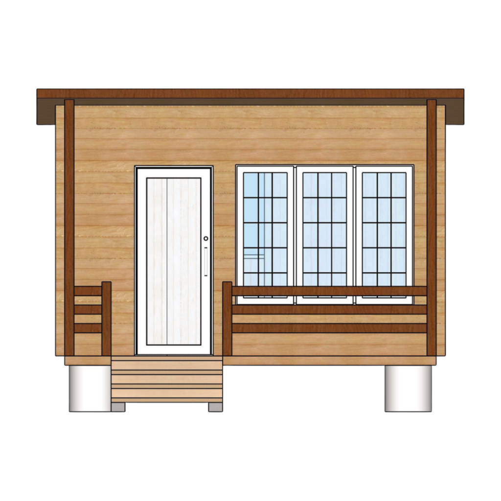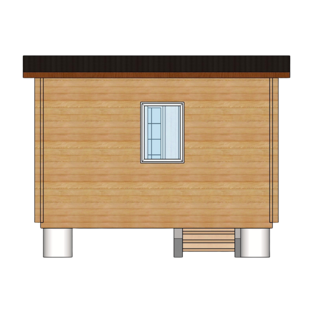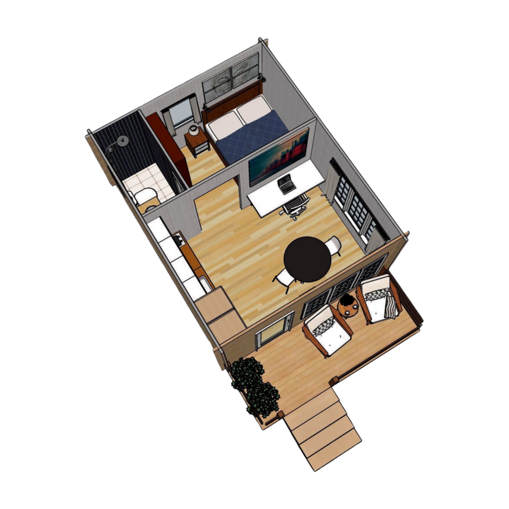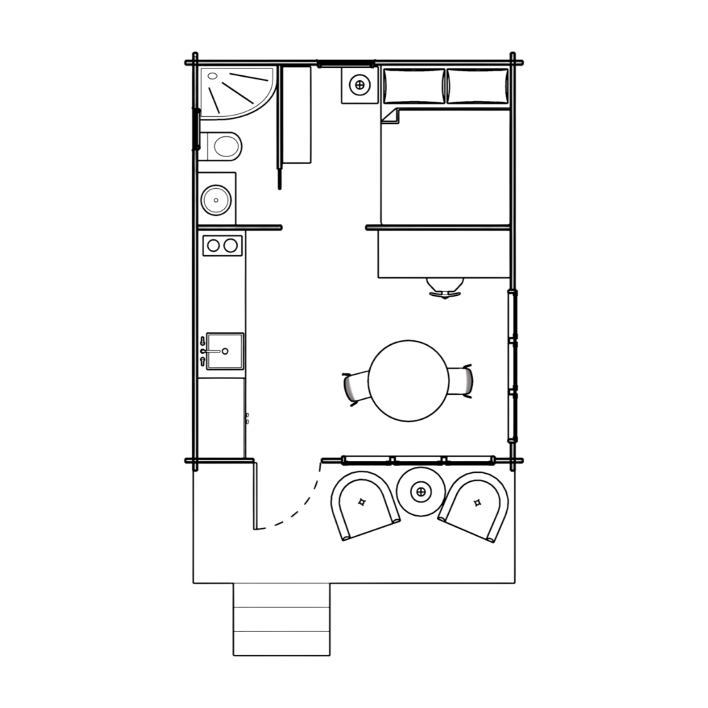 A cozy compact house suitable for a couple. It fits a kitchenette. Includes a small veranda.